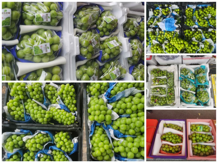9月底,新发地农产品批发市场部分批发商摊位摆放的阳光玫瑰,批发价单价在3元/斤-7元/斤。